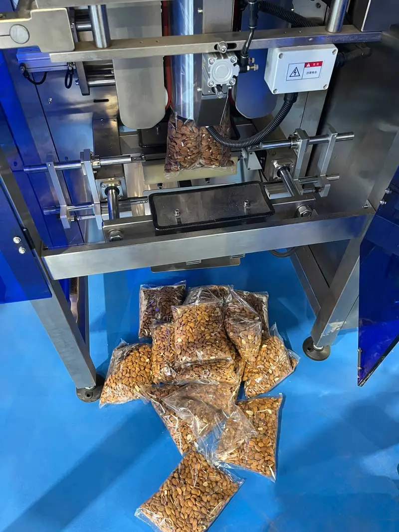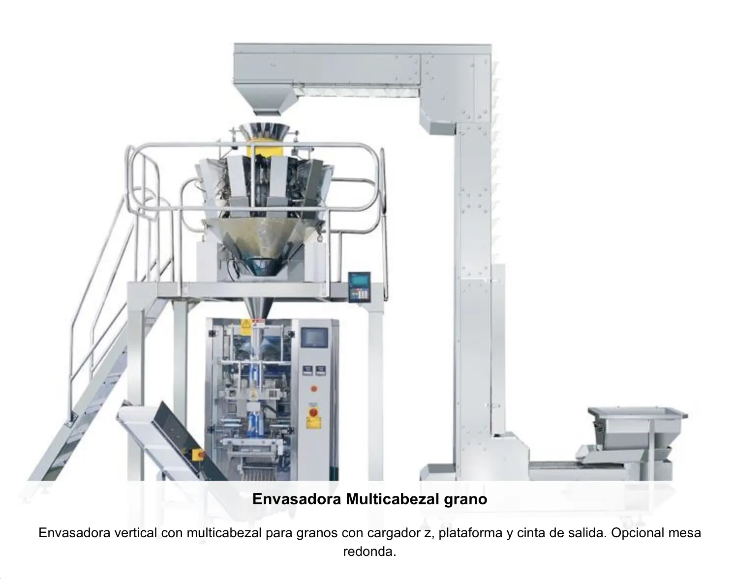 Envasadora vertical con multicabezal para granos con cargador z, plataforma y cinta de salida. Opcional mesa redonda.