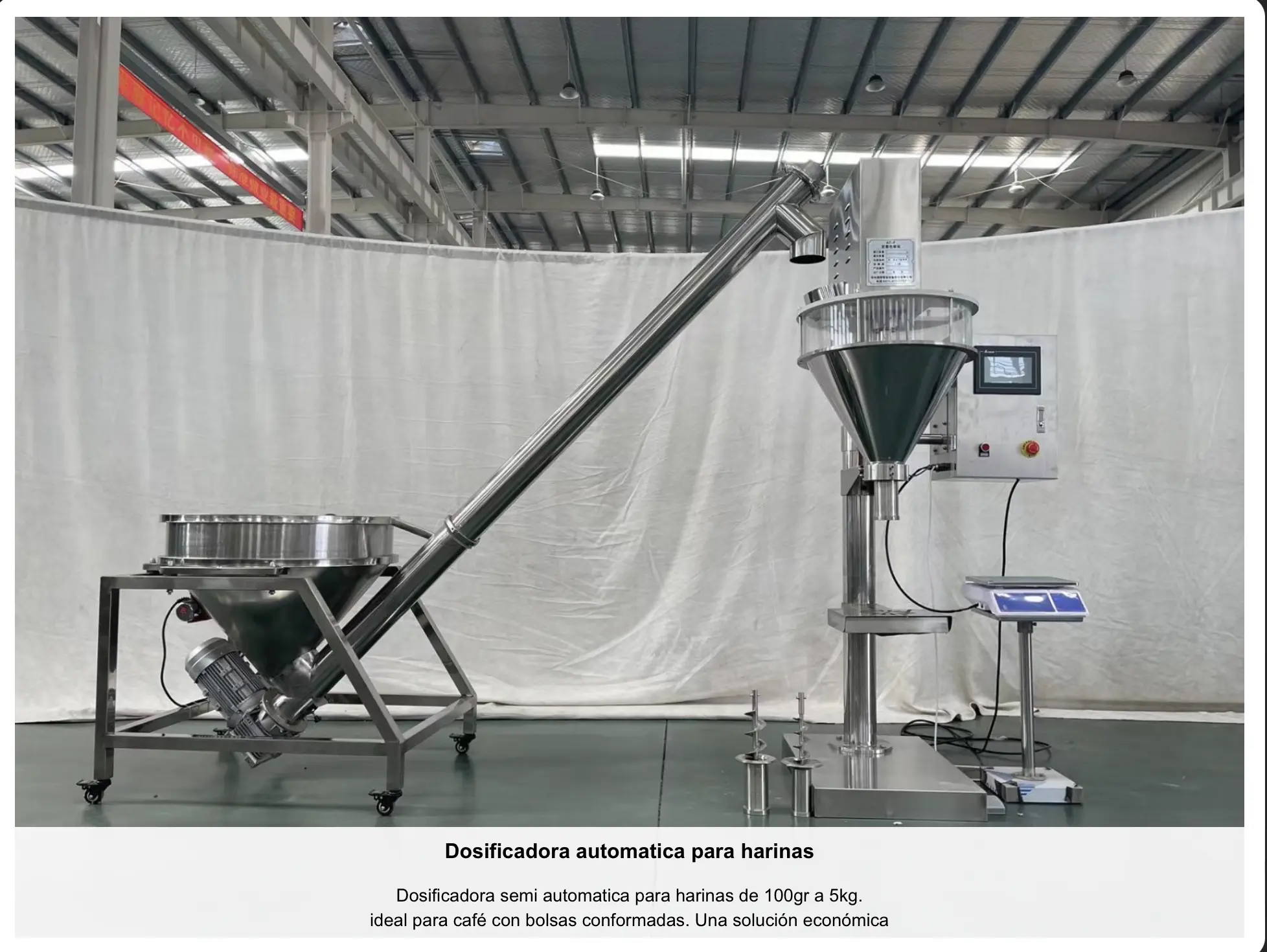 Dosificadora semi automatica para harinas de 100 gr a 5kg. Ideal para café con bolsas conformadas. Una solución económica.